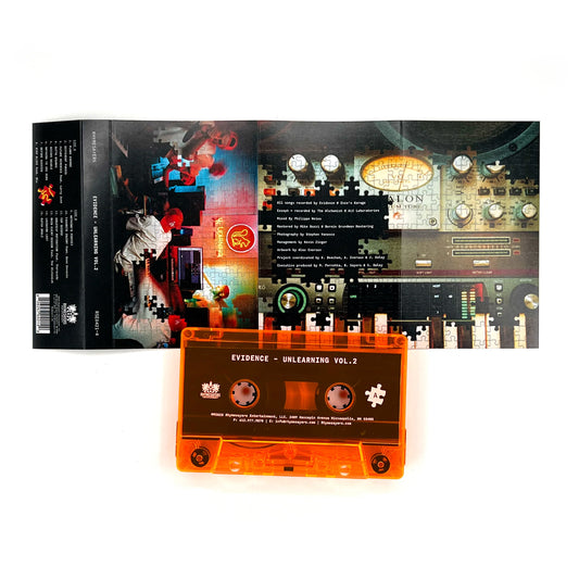 Cassette packaging includes fluorescent orange tint cassette cartridge with single-color imprint and 6-panel printed J-card, all housed in a plastic cassette shell. On the opening track of Unlearning Vol. 2, his...